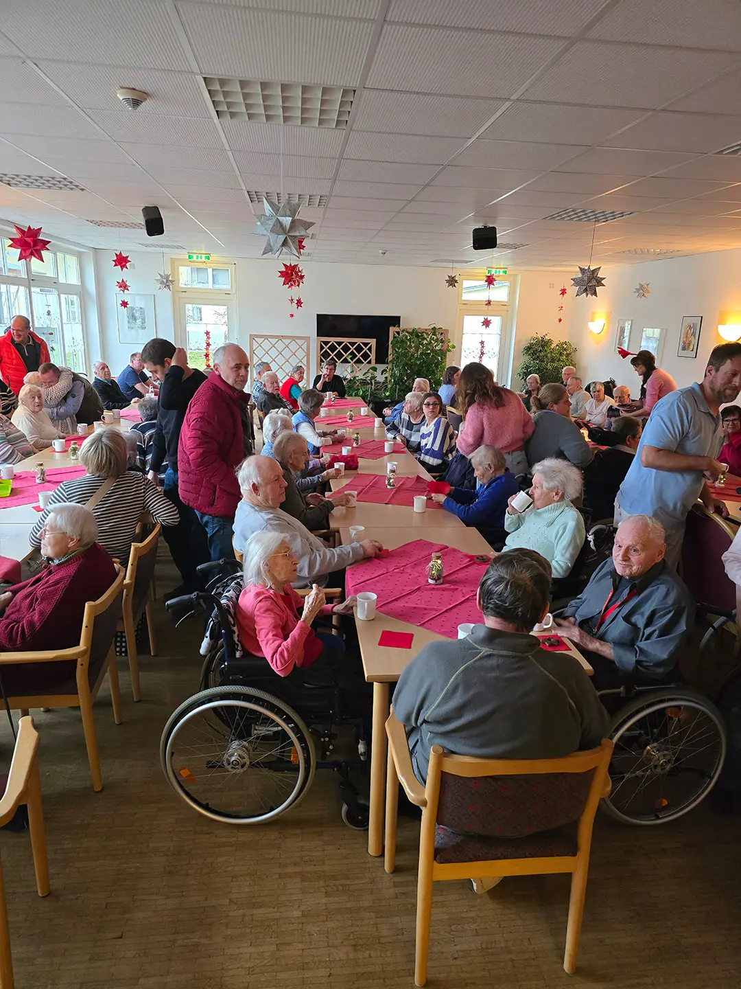Bei Punsch und Glühweinduft, sowie allerlei Naschereien fiel allen Bewohnern und Gästen die Einstimmung in die Adventszeit nicht schwer Bewohner mit ihren Angehörigen und Besucher feierten mit musikalischer Untermalung in fröhlicher und ausgelassener Runde. Der Besuch des Weihnachtsmannes heiterte die gesellige Zusammenkunft noch weiter auf. Auch Angehörige und Besucher genossen die ungezwungene und fröhliche Atmosphäre, die im gesamten Haus herrschte.