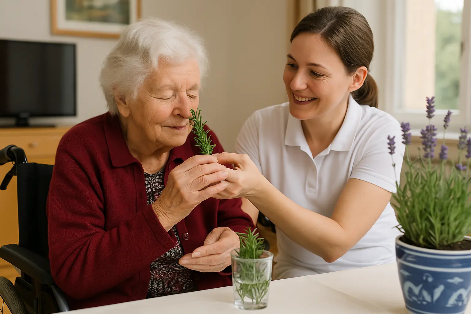 Die Bewohnerin, die ihr Bett selbst nicht mehr verlassen kann, genießt den Duft, sieht die grünen Blätter, fühlt ihre Struktur – riecht, schmeckt, erinnert sich.